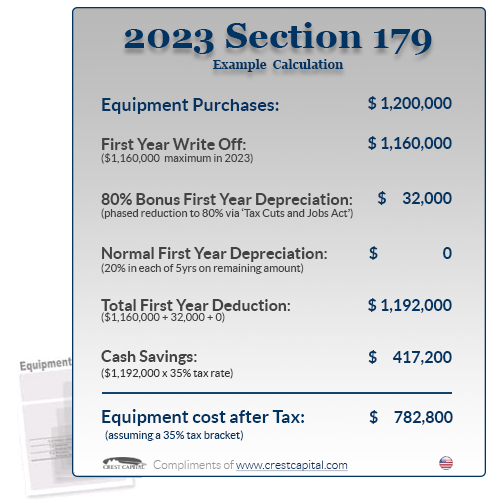 This has made a big difference for many companies (and the economy in general.) Businesses have used Section 179 to purchase needed equipment right now, instead of waiting. For most small businesses, the entire cost of qualifying equipment can be written-off on the 2023 tax return (up to $1,160,000). See example below.